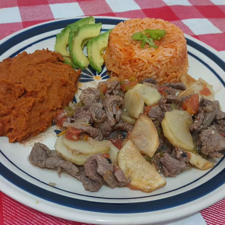 Bistec, arroz rojo, frijoles de fiesta, tortillas y salsa de la casa.