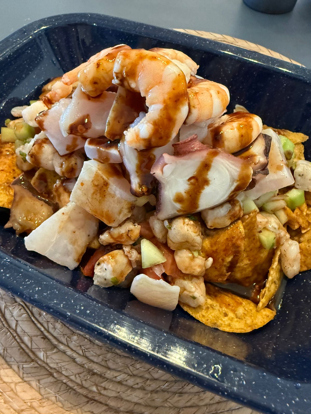 (ceviche de camarón, con callo de lobina, pulpo y camarón cocido)
