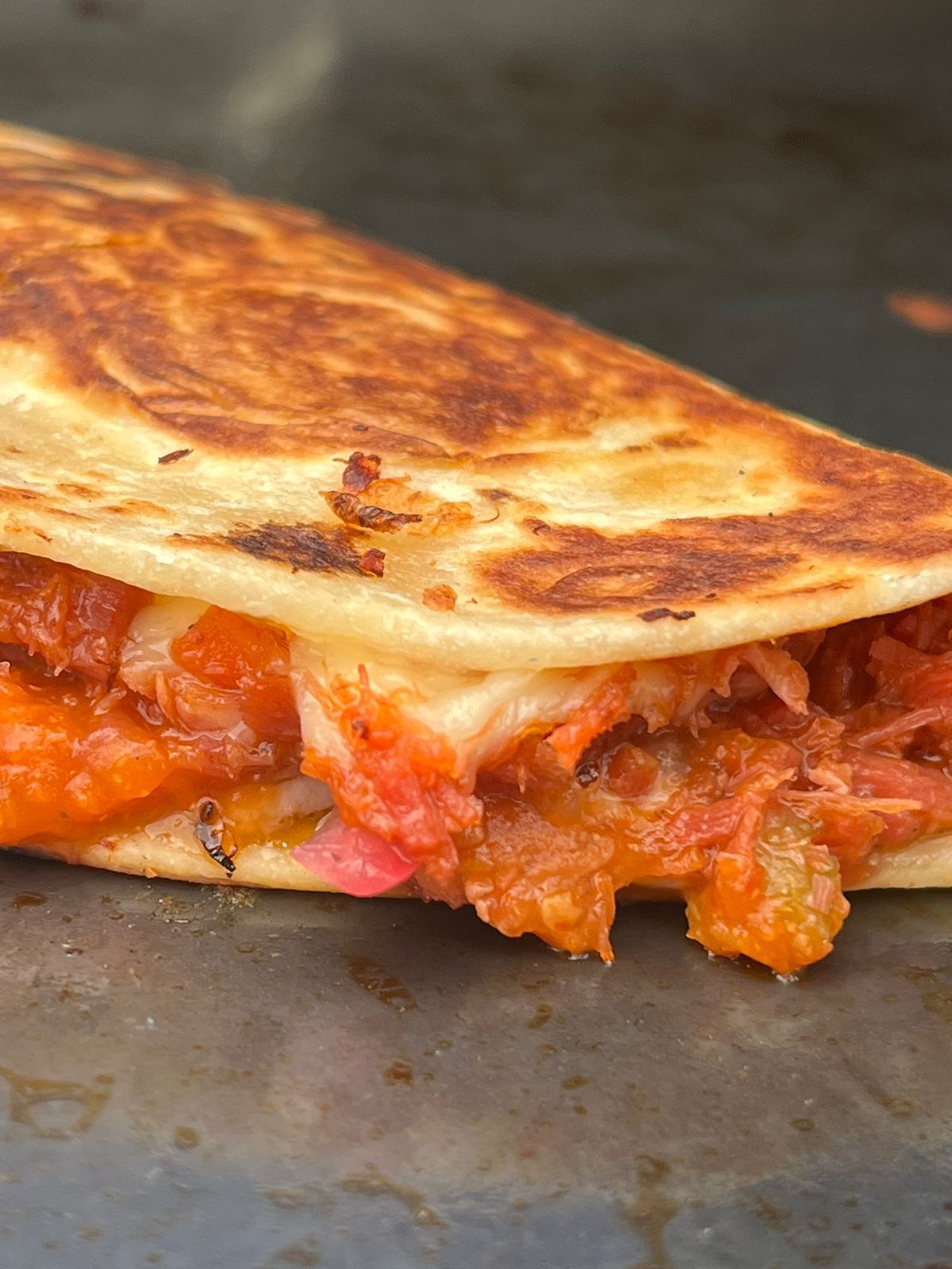 Quesadilla de marlin preparado, tortilla doble gordita de harina con queso.