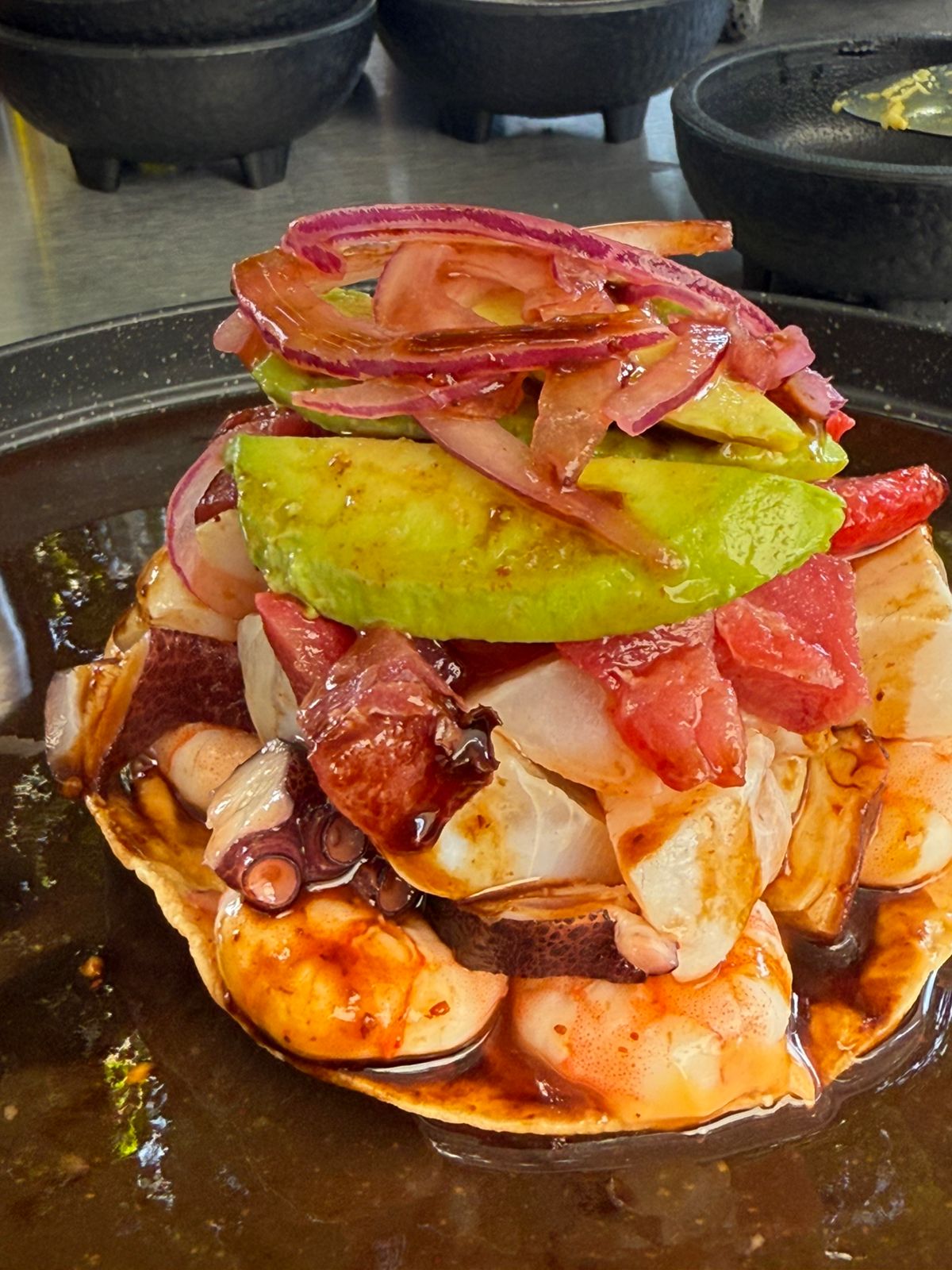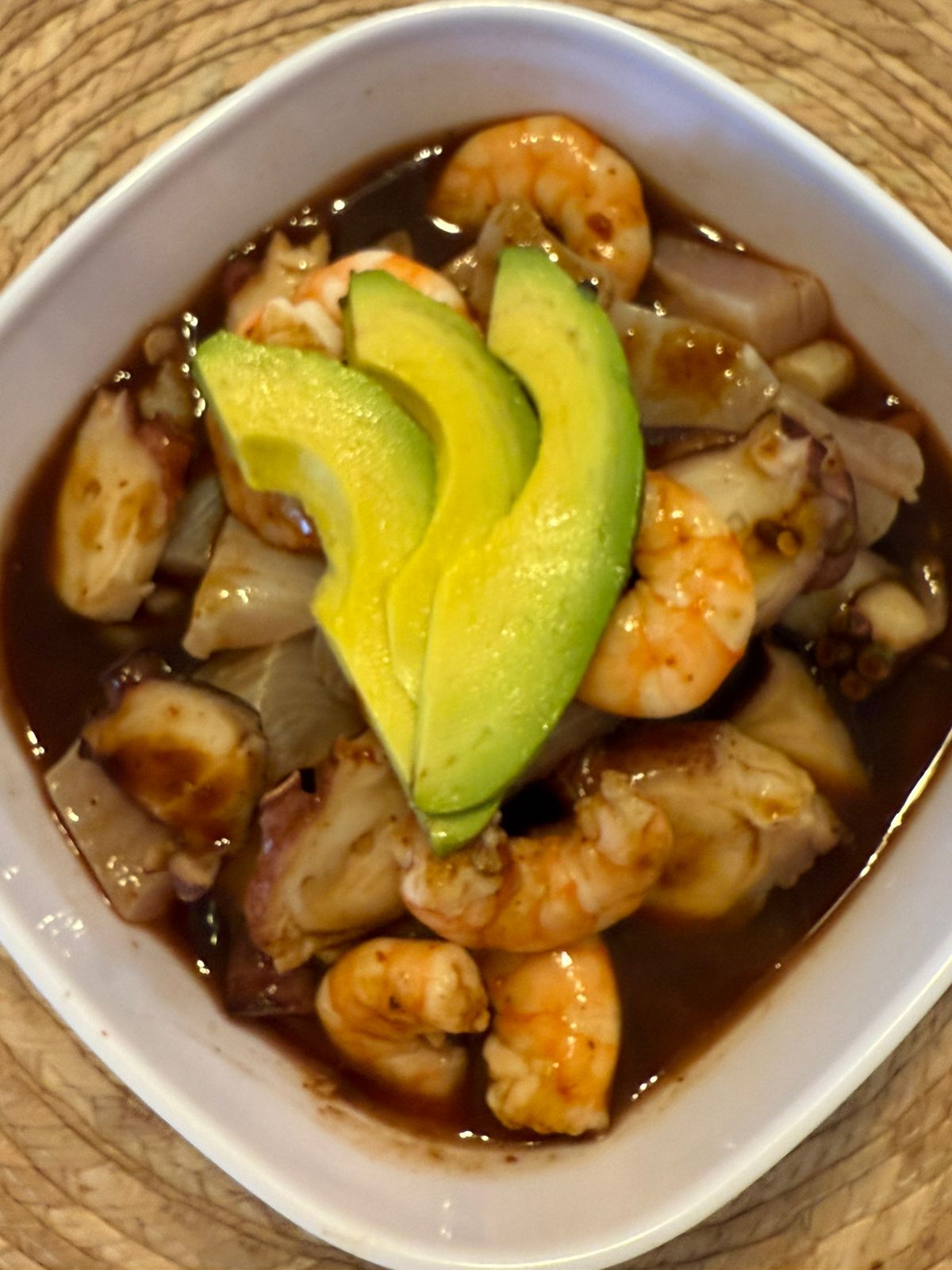 eviche de camarón, con callo de lobina, pulpo y camarón cocido)
