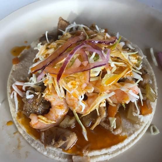 Taco con guiso de camarón y pulpo enchiloso con queso.