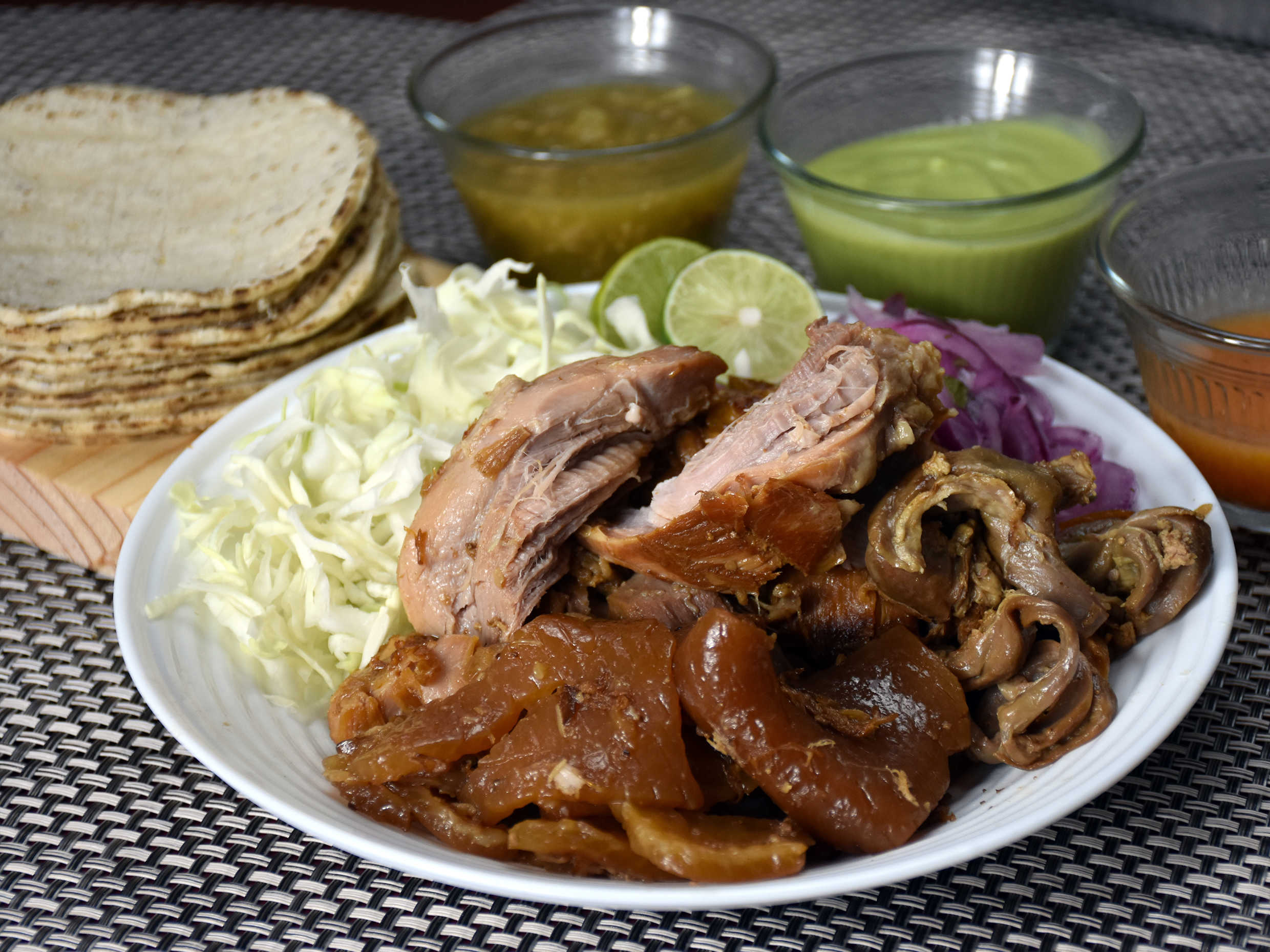 500gr de Carnitas de cerdo picada, incluye tortillas, guacamole, repollo, cebolla, limones, salsa verde y salsa habanero