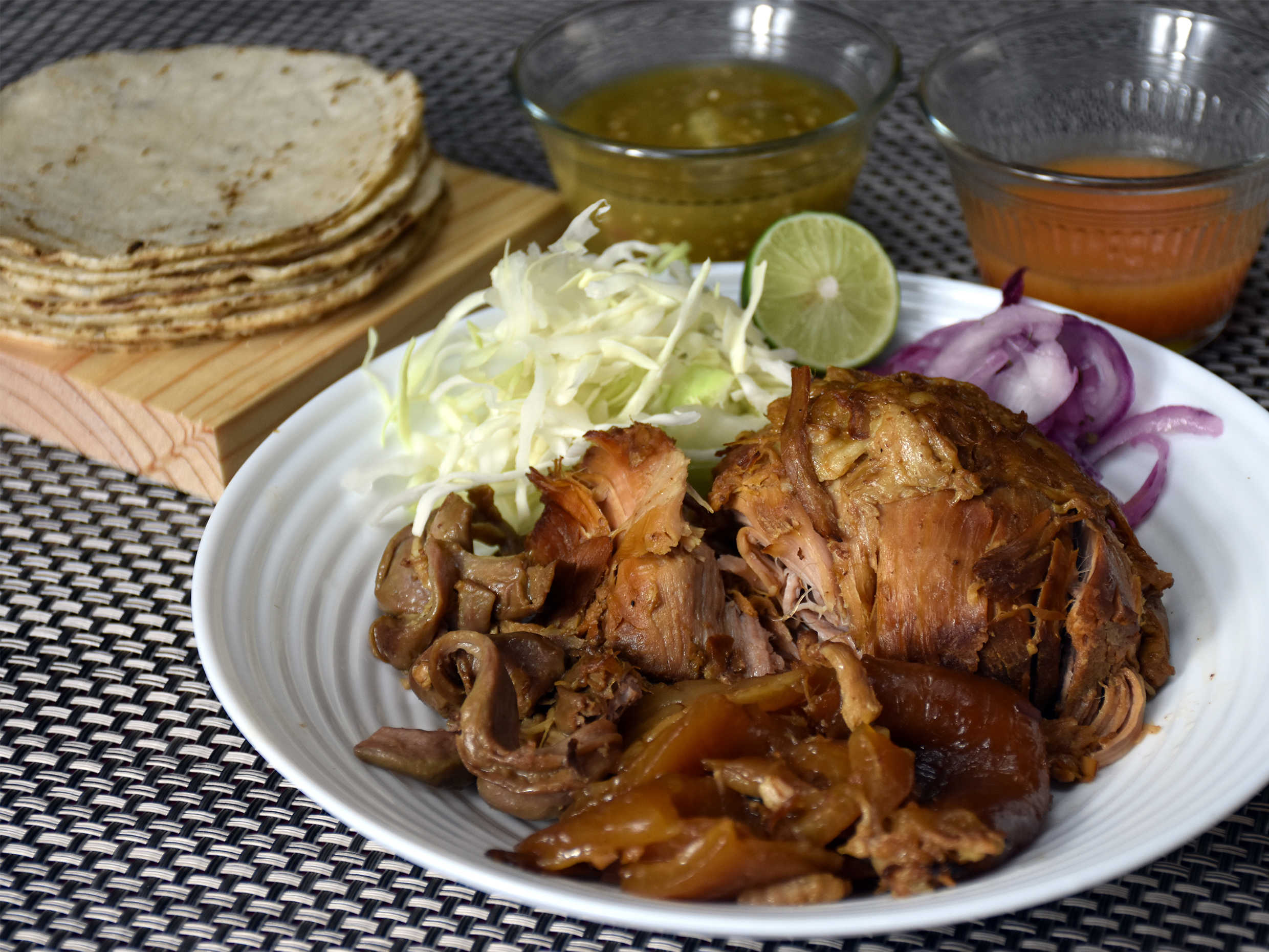 1 kg de Carnitas de cerdo picada, incluye tortillas, guacamole, repollo, cebolla, limones, salsa verde y salsa habanero