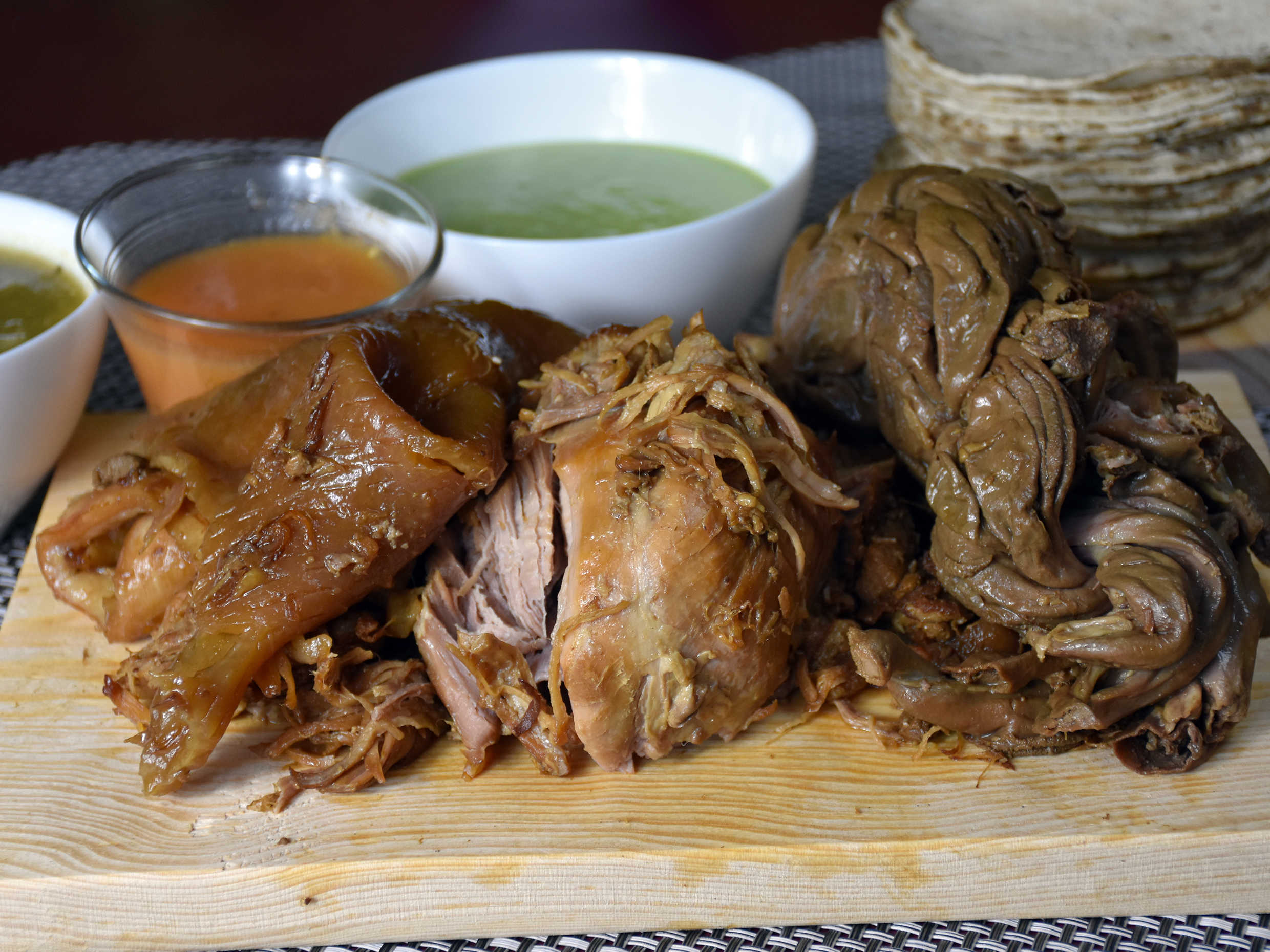 750gr de Carnitas con cuerito, tripa y pancita picada, incluye tortillas, guacamole, repollo, cebolla, limones, salsa verde y salsa habanero