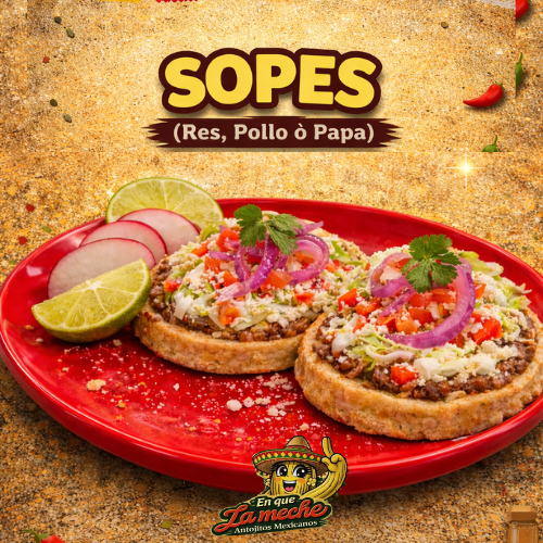 1 Sope de (Res, Pollo ó Papa) a elegir, con lechuga, tomate, cebolla morada curtida, rábano, pepino, limón, queso, crema y salsa
