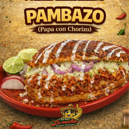 Pan Birote bañado en Adobo con Papa con Chorizo, crema queso, verdura/salsas aparteDe papa con chorizo