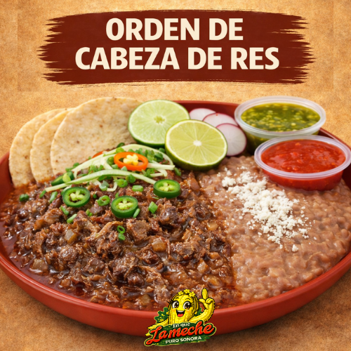 1 Plato de Cabeza de Res en caldo, acompañado de Tortillas de maíz y verduras/salsas de su elección.