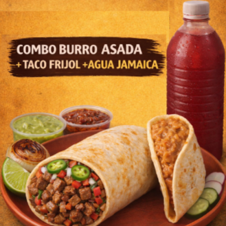 COMBO Burro Asada+ Taco frijol+ Agua Jamaica 1 lt