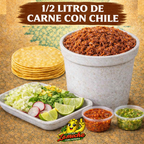 1/2 Litro de Carne con Chile, Incluye verdura, Salsa y Tortillas
