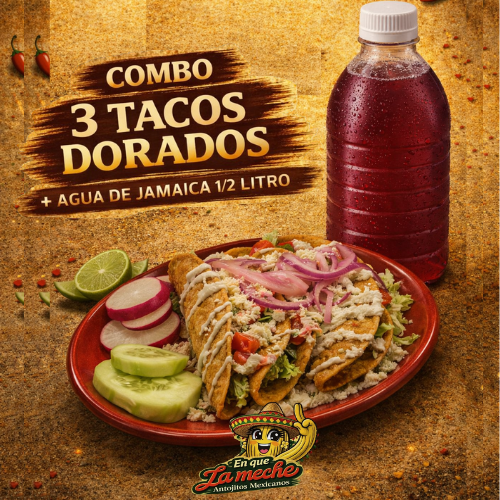 COMBO 3 Tacos Dorados+ Agua de Jamaica
