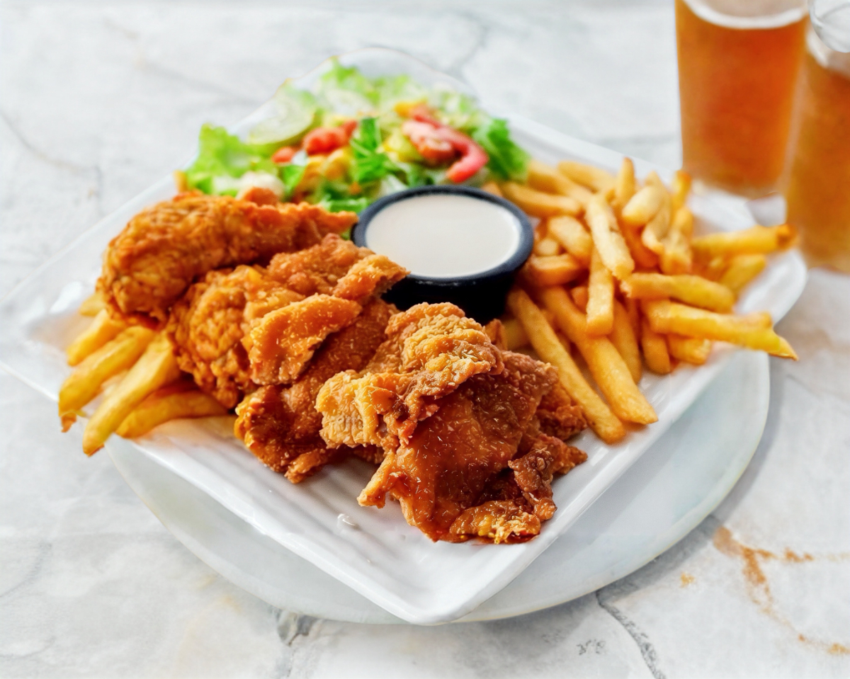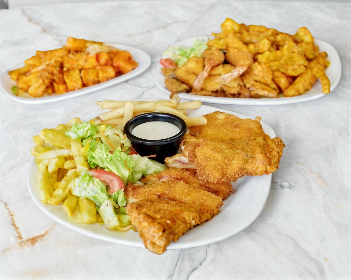 Filete de pollo, camarón empanizados acompañada de 200 g de papas a la francesa, ensalada con tomate, lechuga, pepino, zanahoria.