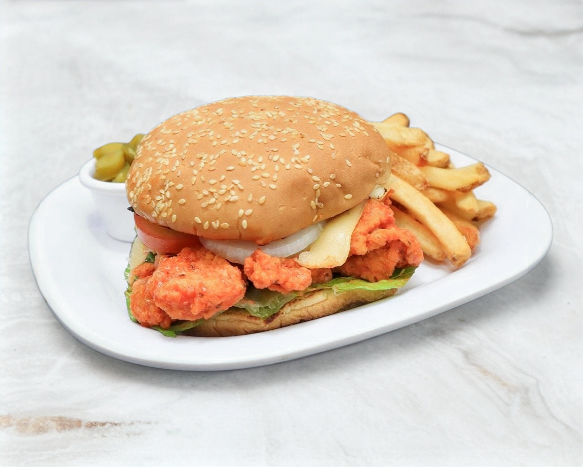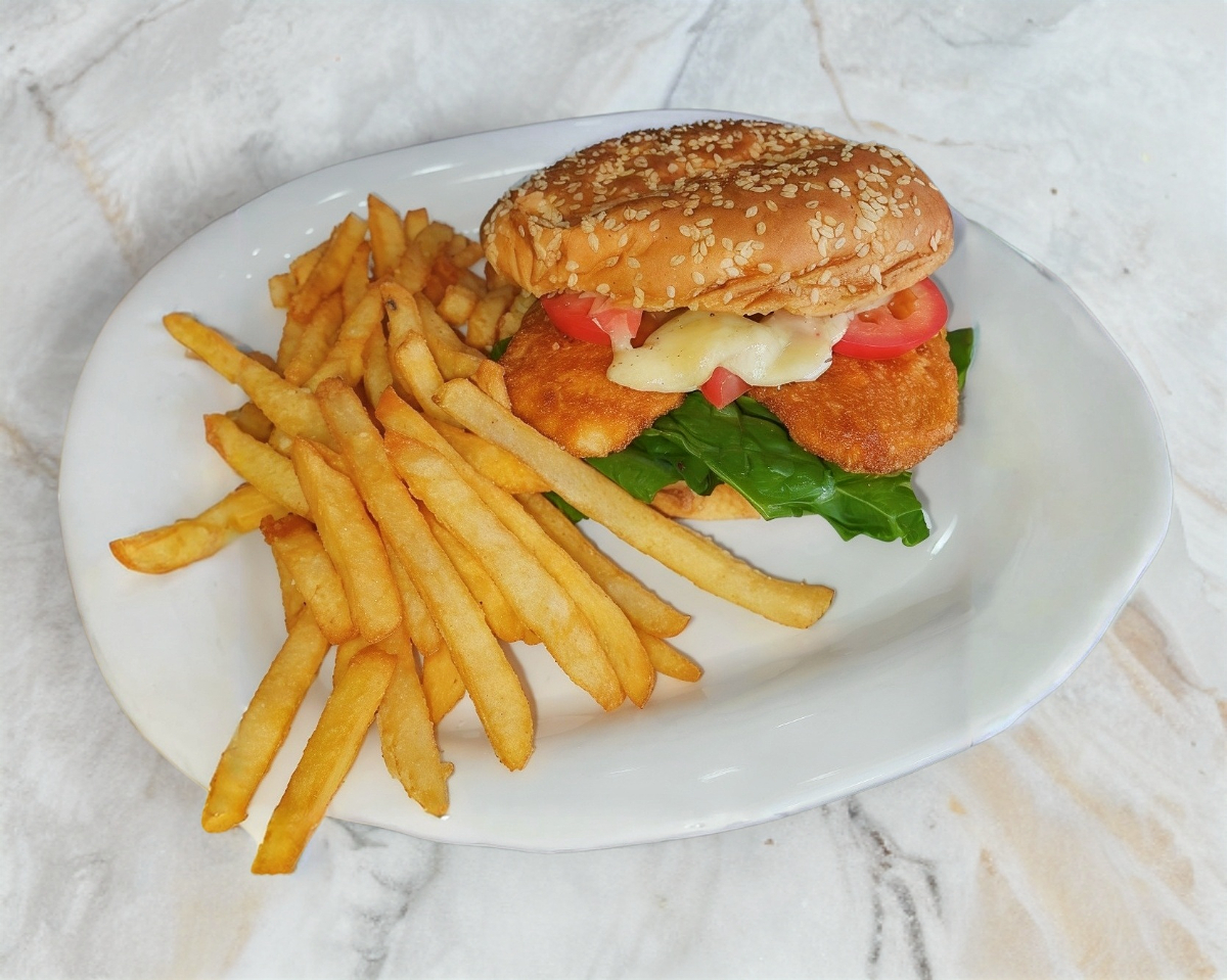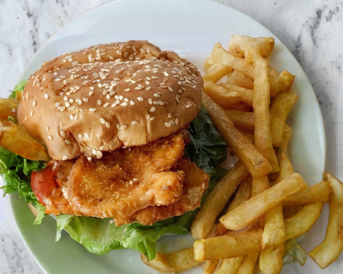 Hamburguesa de milanesa de pollo acompañada de papas fritas, pepinillos, y rajas de jalapeño.