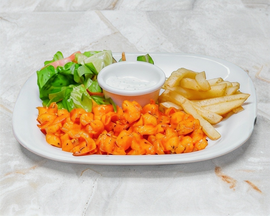Boneless de camarón acompañados de aderezo ranch, papas a la francesa y ensalada con lechuga, tomate, pepino y zanahoria.