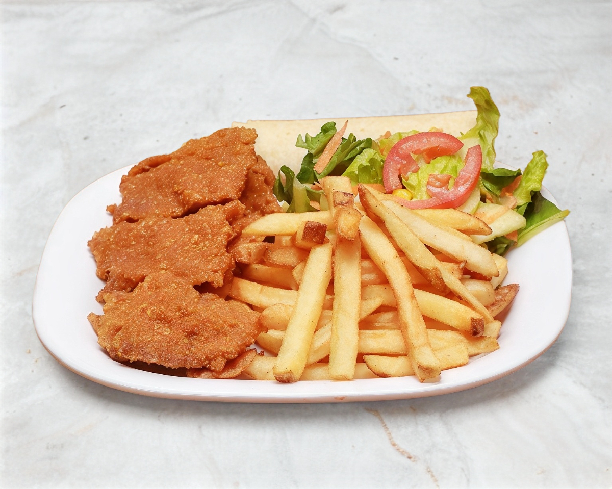 Filete de pollo empanizado acompañada de 200 g de papas a la francesa, ensalada con tomate, lechuga, pepino, zanahoria y aderezo de jalapeño. (Porción personal)