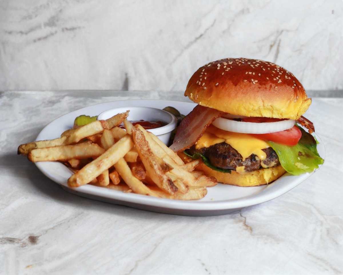 Hamburguesa boneless acompañada de papas fritas, pepinillos,y rajas de jalapeño.