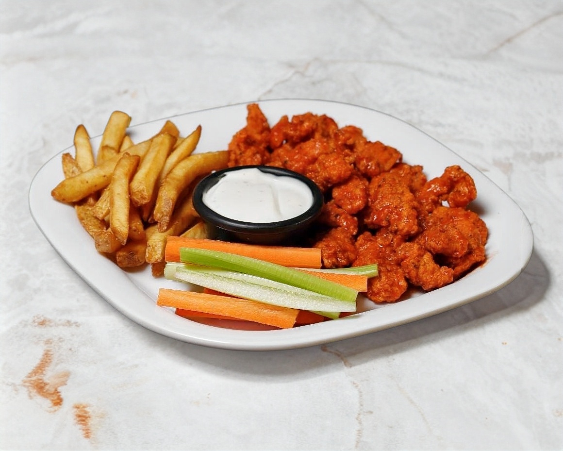 Boneless 350 g en salsa a elegir, tiras de apio, zanahoria, aderezo rancho y 200 g de papas a la francesa.