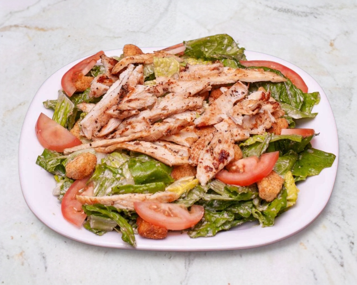 Pollo a la plancha, lechuga orejones, tomate, crotones y aderezo rancho.