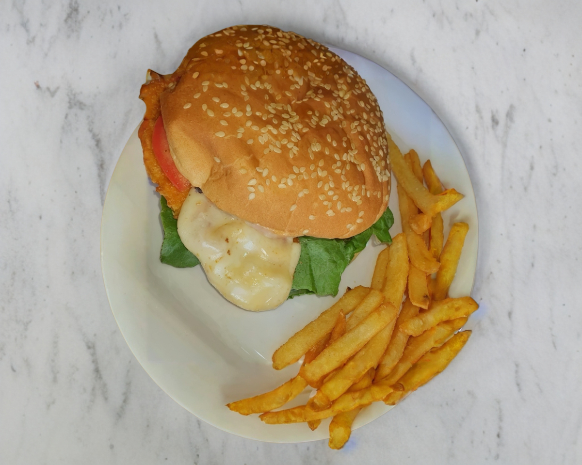 Hamburguesa de milanesa rellena de queso acompañada de papas fritas, pepinillos y rajas de jalapeño.