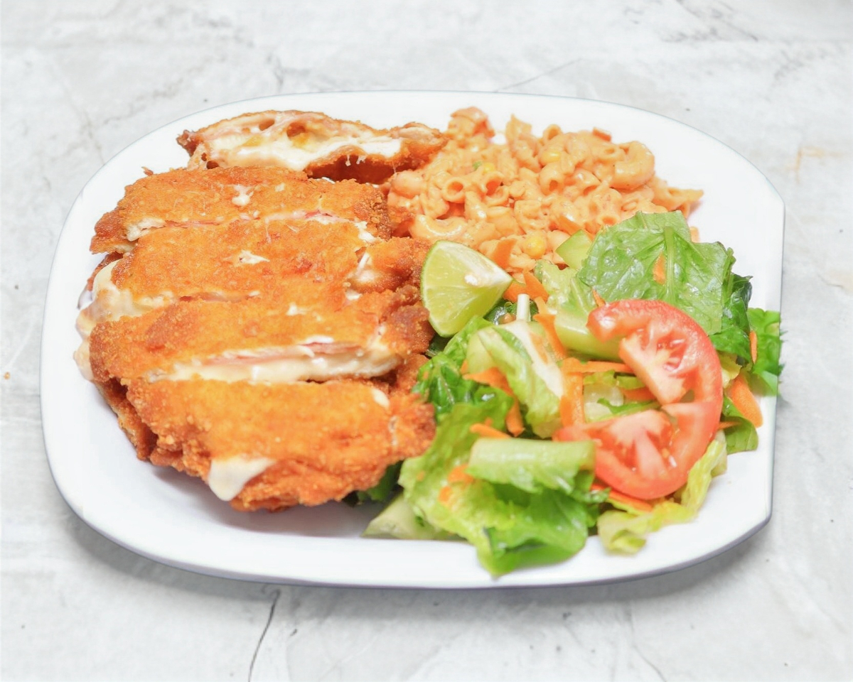 Milanesa de pollo rellena con queso y jamón, acompañada de 200 g de papas a la francesa, ensalada con tomate, lechuga, pepino, zanahoria.