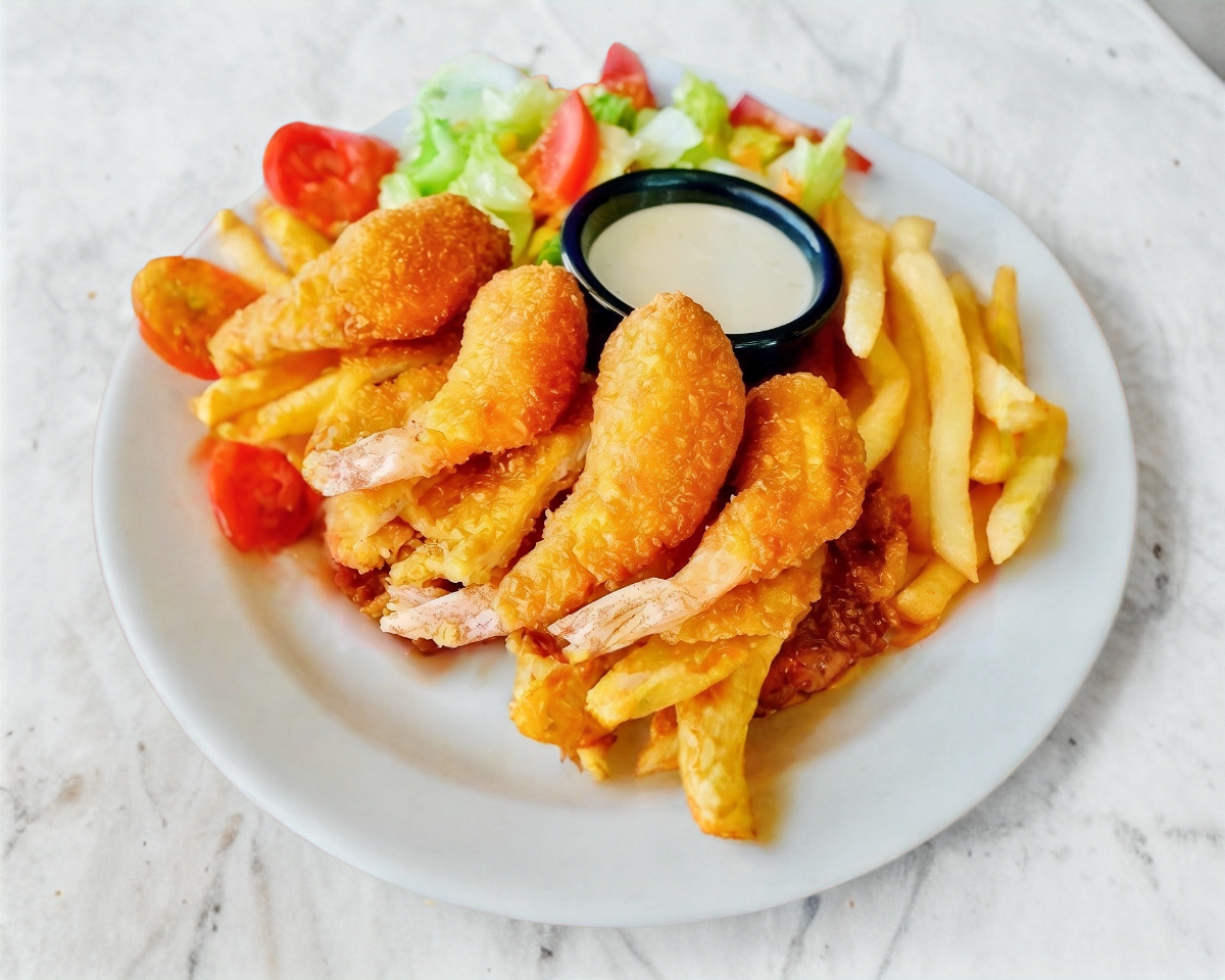 Camarones empanizados acompañada de 200 g de papas a la francesa, ensalada con tomate, lechuga, pepino, zanahoria.