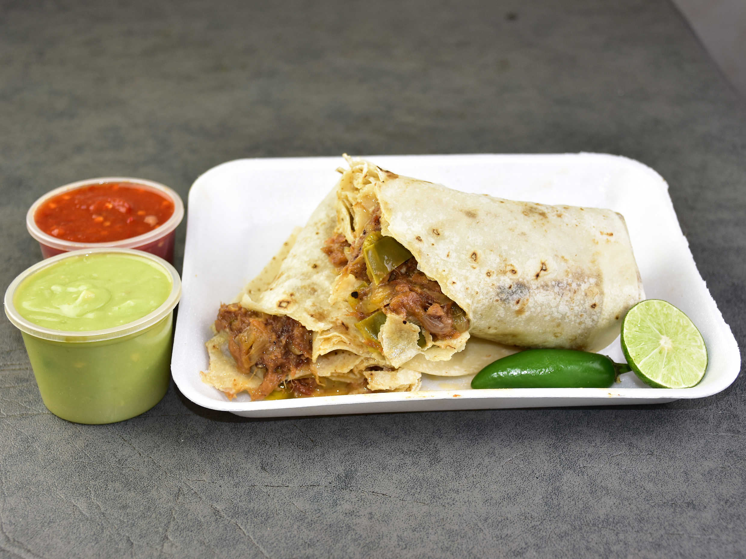 Burro con tortilla sobaquera, hecha a mano con carne asada y tripa de res.