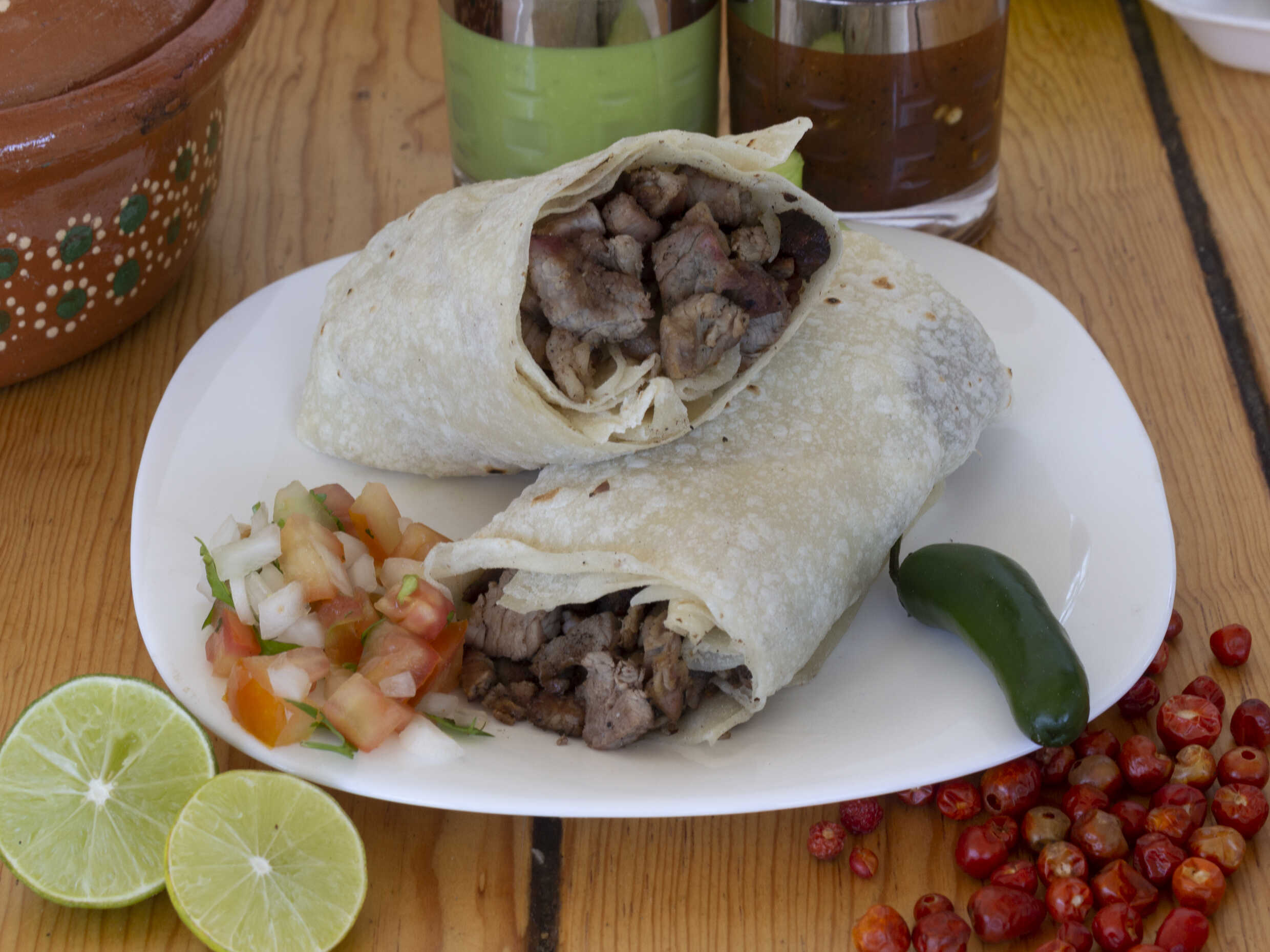 Burro con tortilla sobaquera, hecha a mano, con chilorio de cerdo estilo sinaloa.