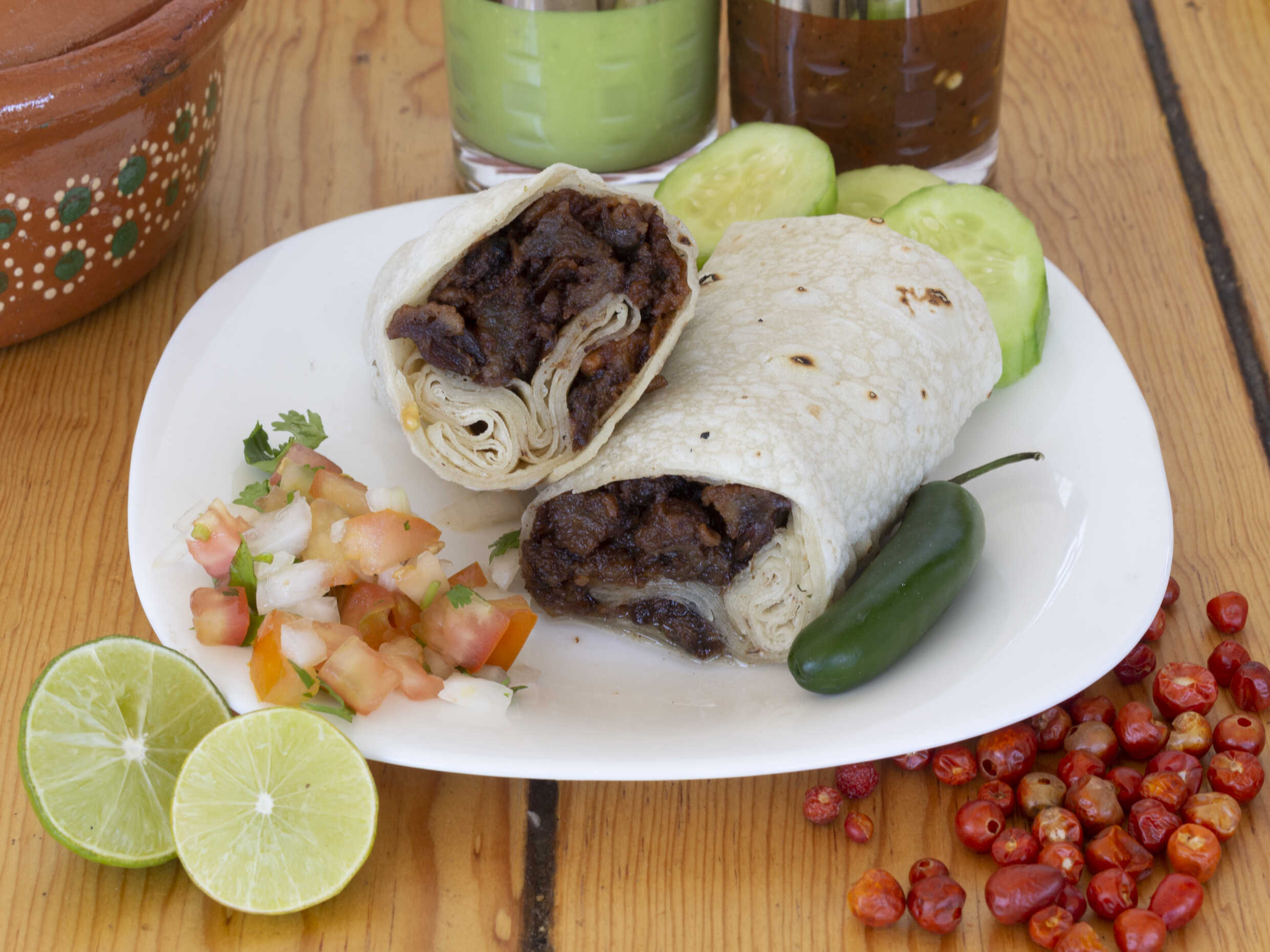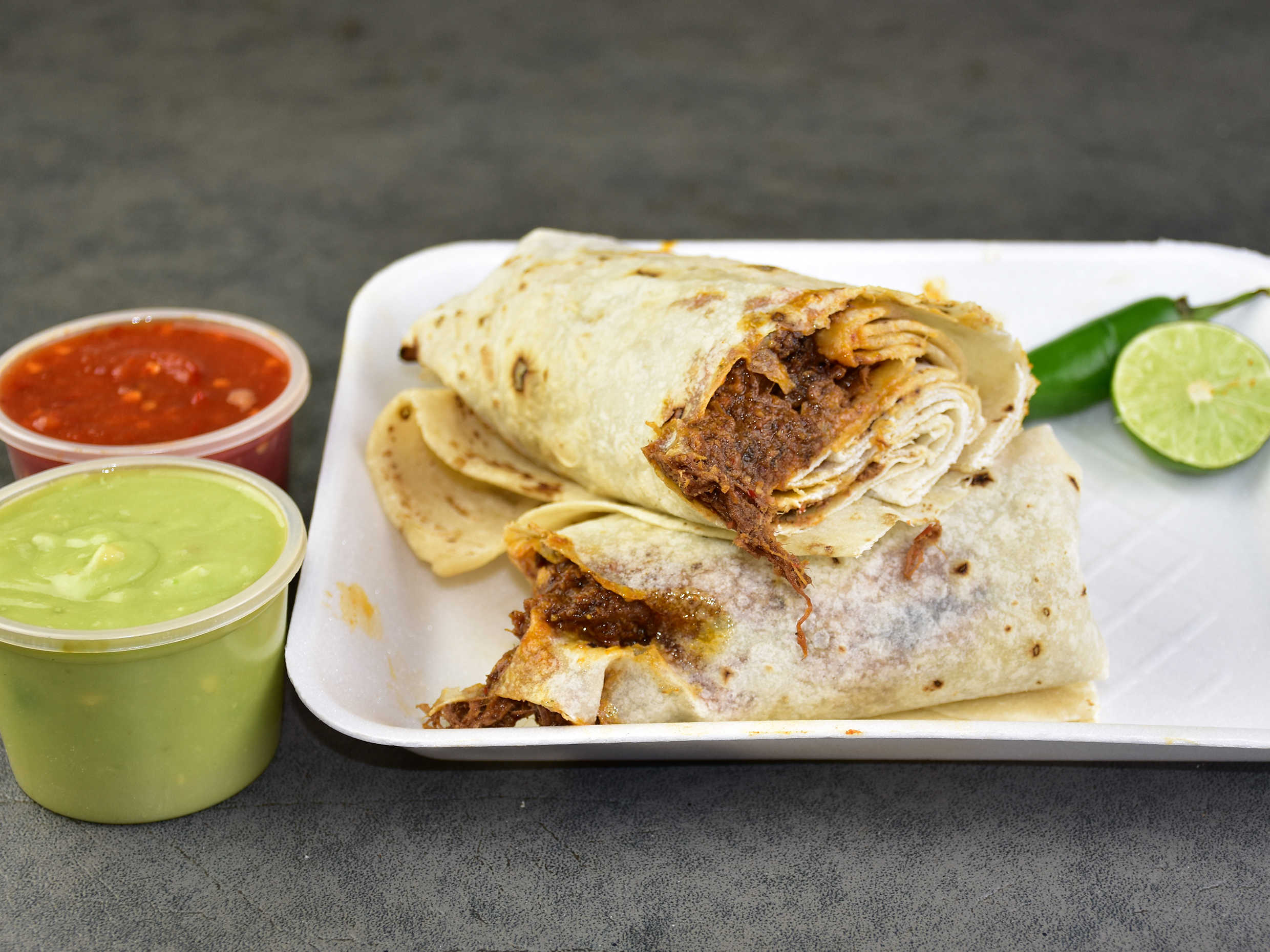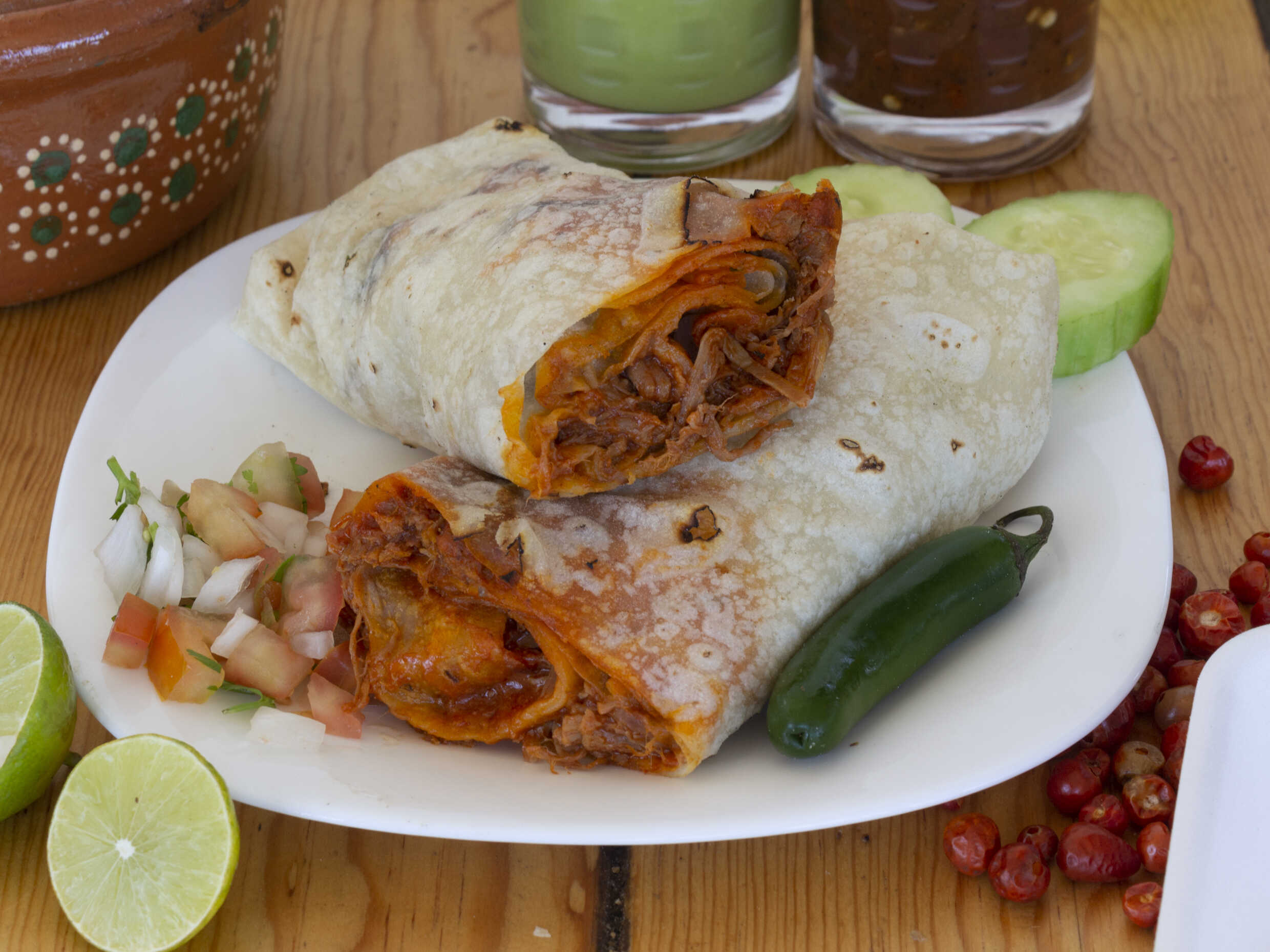 Burro con tortilla sobaquera, hecha a mano, con carne deshebrada de res con el tradicional chile colorado sonorense.