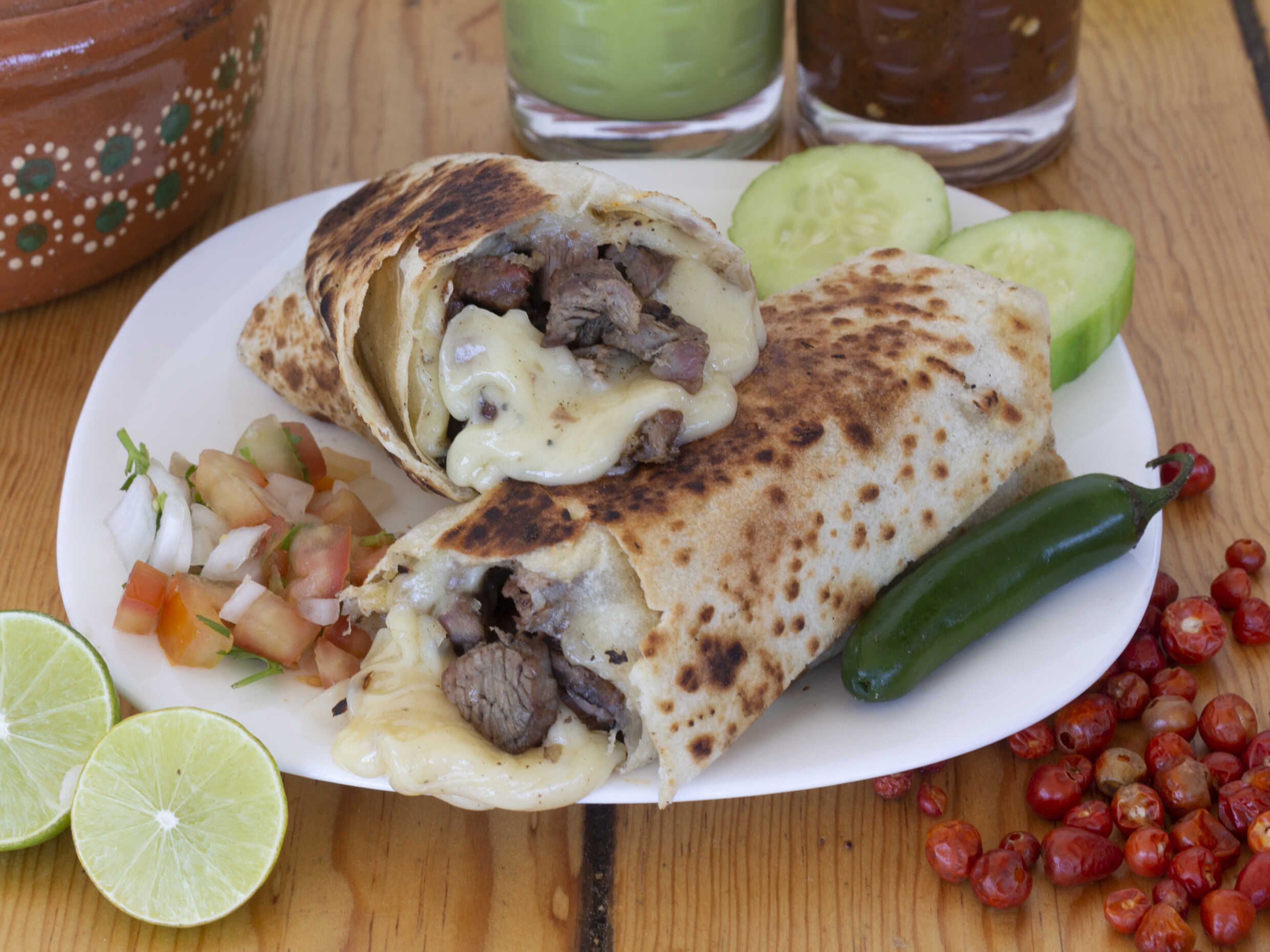 Burro con tortilla sobaquera, hecha a mano, con carne asada, frijol y queso chihuahua dorado a la parrilla.