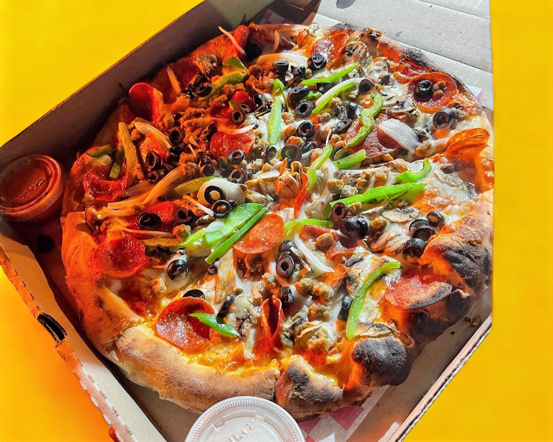 Salchicha italiana, peperoni, champiñones, cebolla blanca, aceituna negra y pimiento negro.