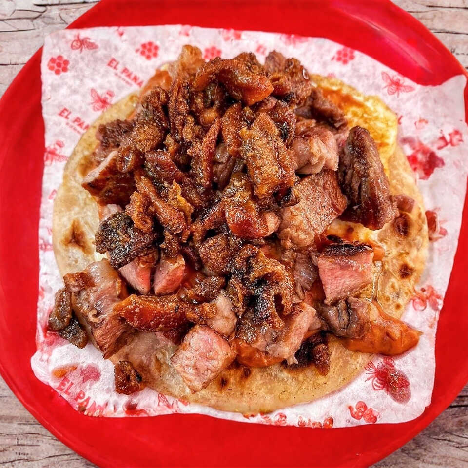 Quesadilla doble con carne asada, chicharron, frijoles y chile verde