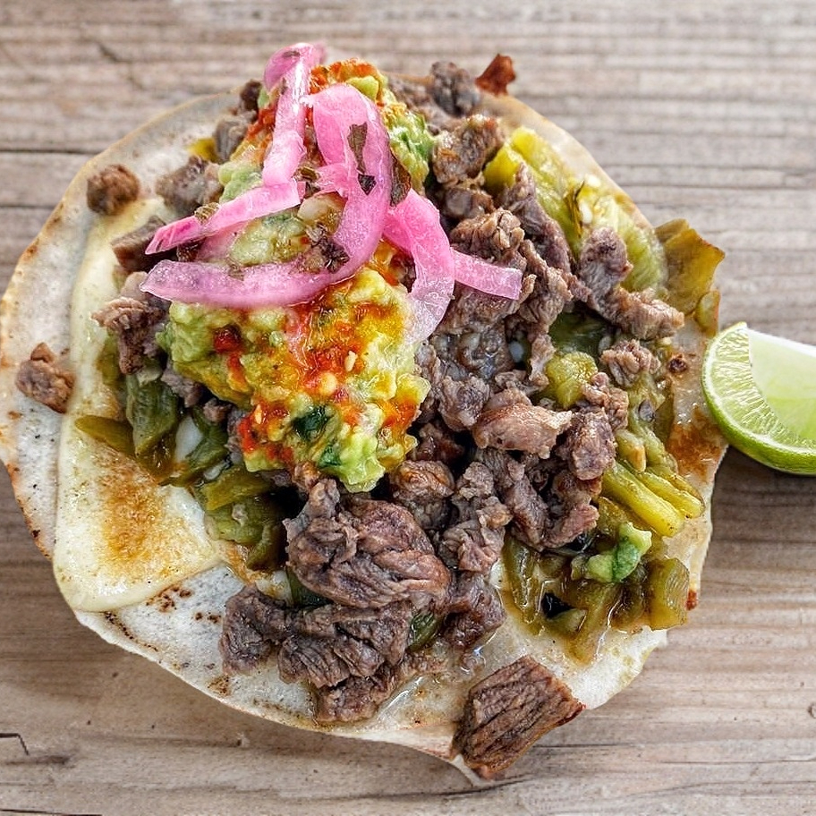 Rico taco de carne asada (salsa, cebolla con cilantro y limones, cebolla curtida).