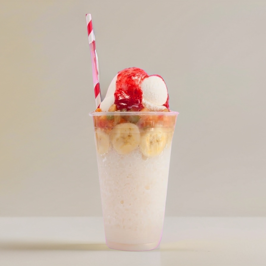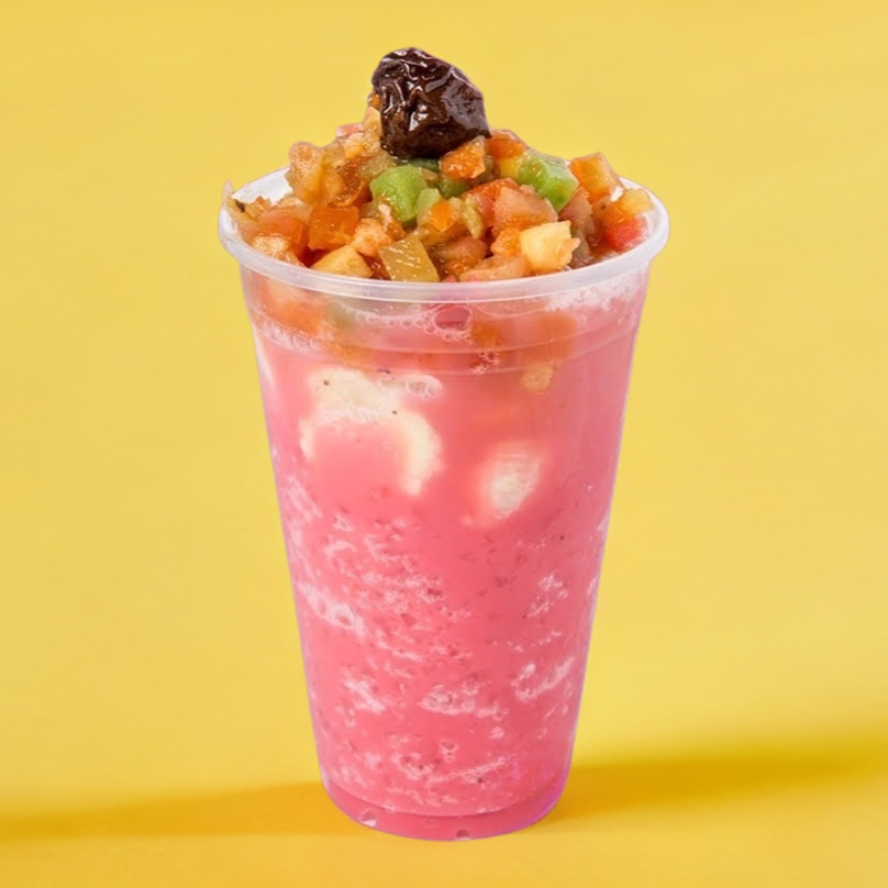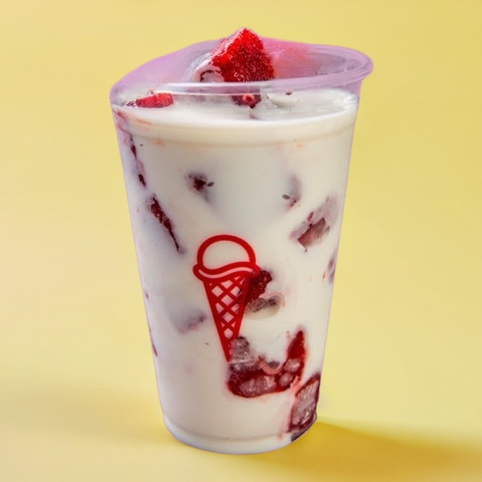 Raspado de leche de fresa y frutas de temporada.