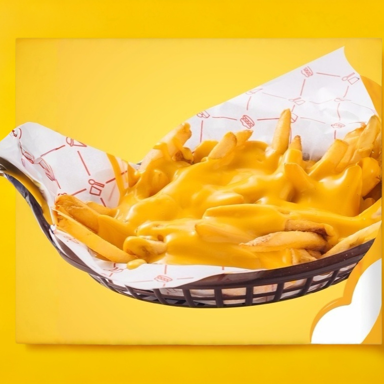 Panchos con papas fritas bañadas con queso amarillo, 300 gr.