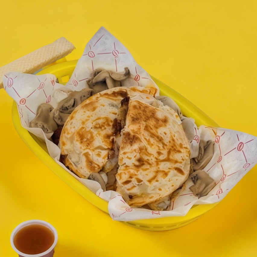 Quesadilla con 2 tortillas gorditas de harina, queso chihuahua, nuestro delicioso chilorio y champiñones.