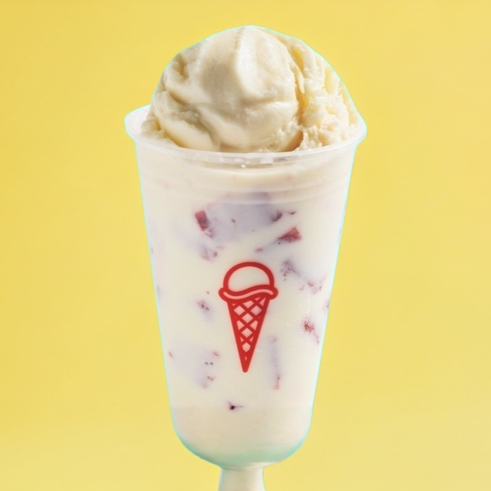 Fresas congeladas con crema y una bola de nieve sabor vainilla.