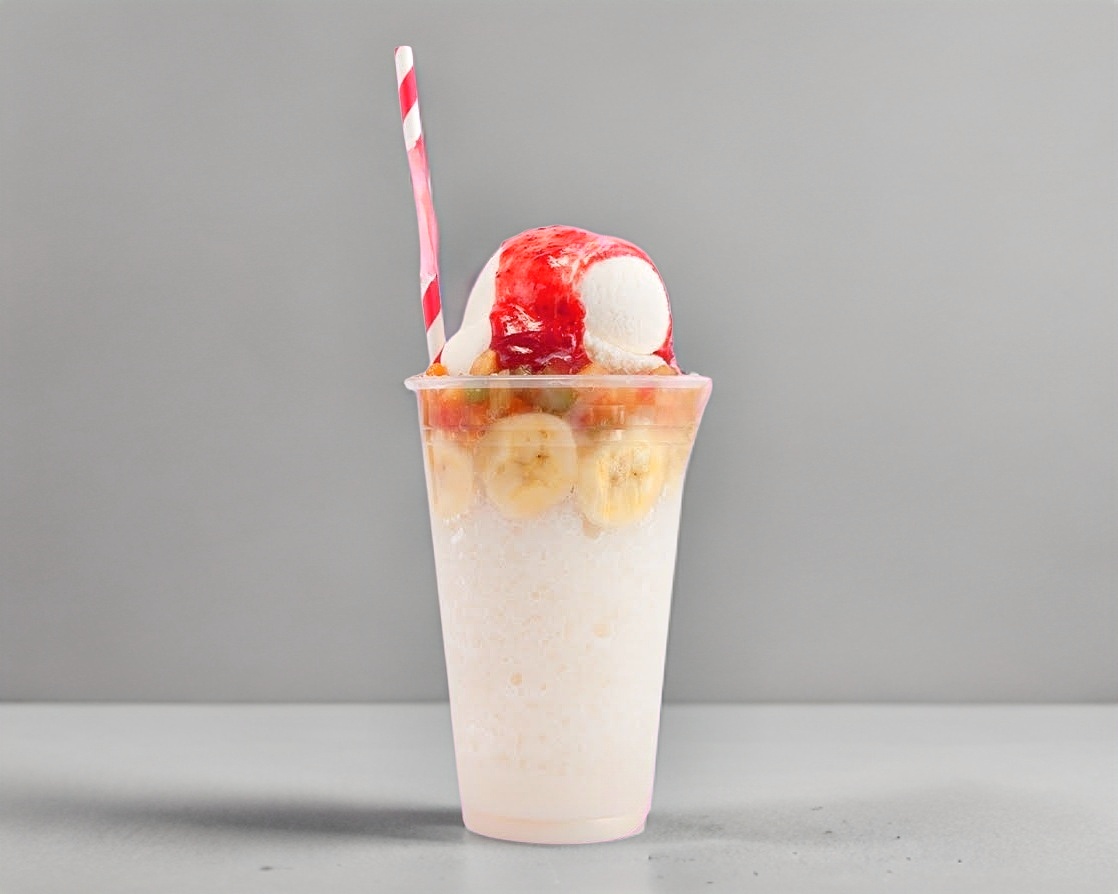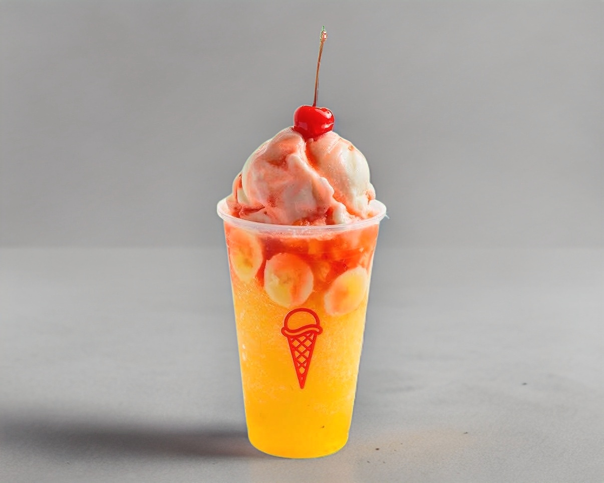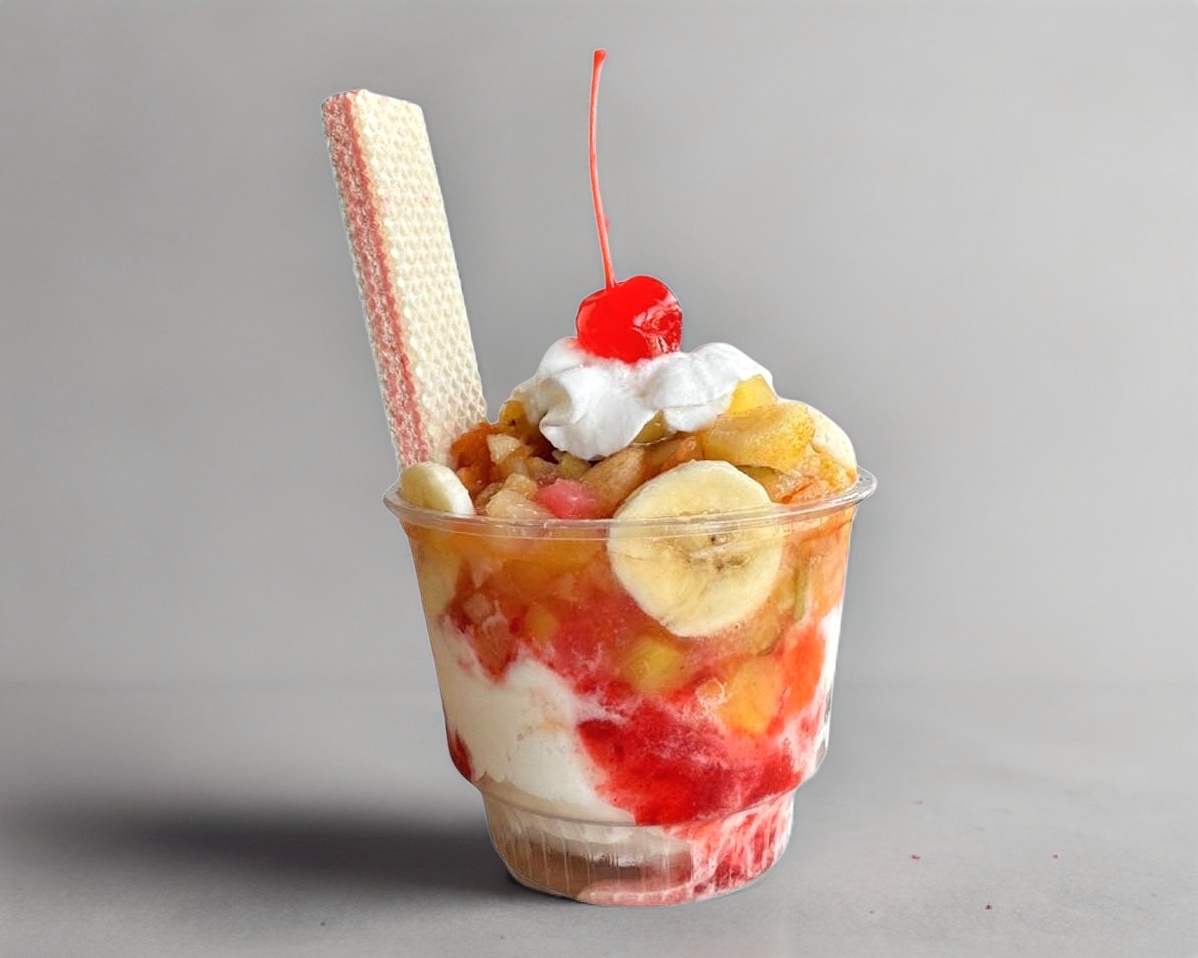 1 bola de nieve sabor vainilla, plátano, fruta de temporada, mermelada fresa, cereza y galleta.