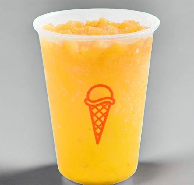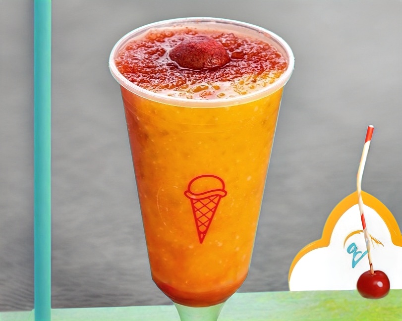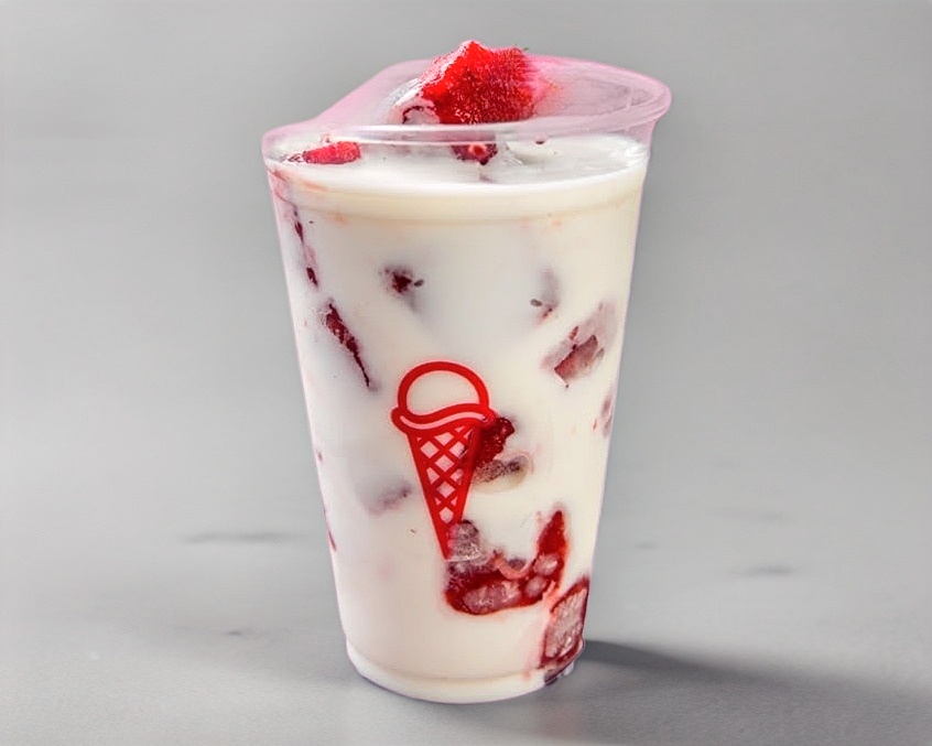 Raspado de leche vainilla, fruta de temporada, nieve de vainilla y mermelada de fresa.