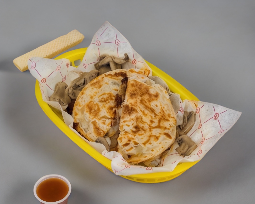 Quesadilla con 2 tortillas gorditas de harina, queso chihuahua, carne adobada y cebolla asada.