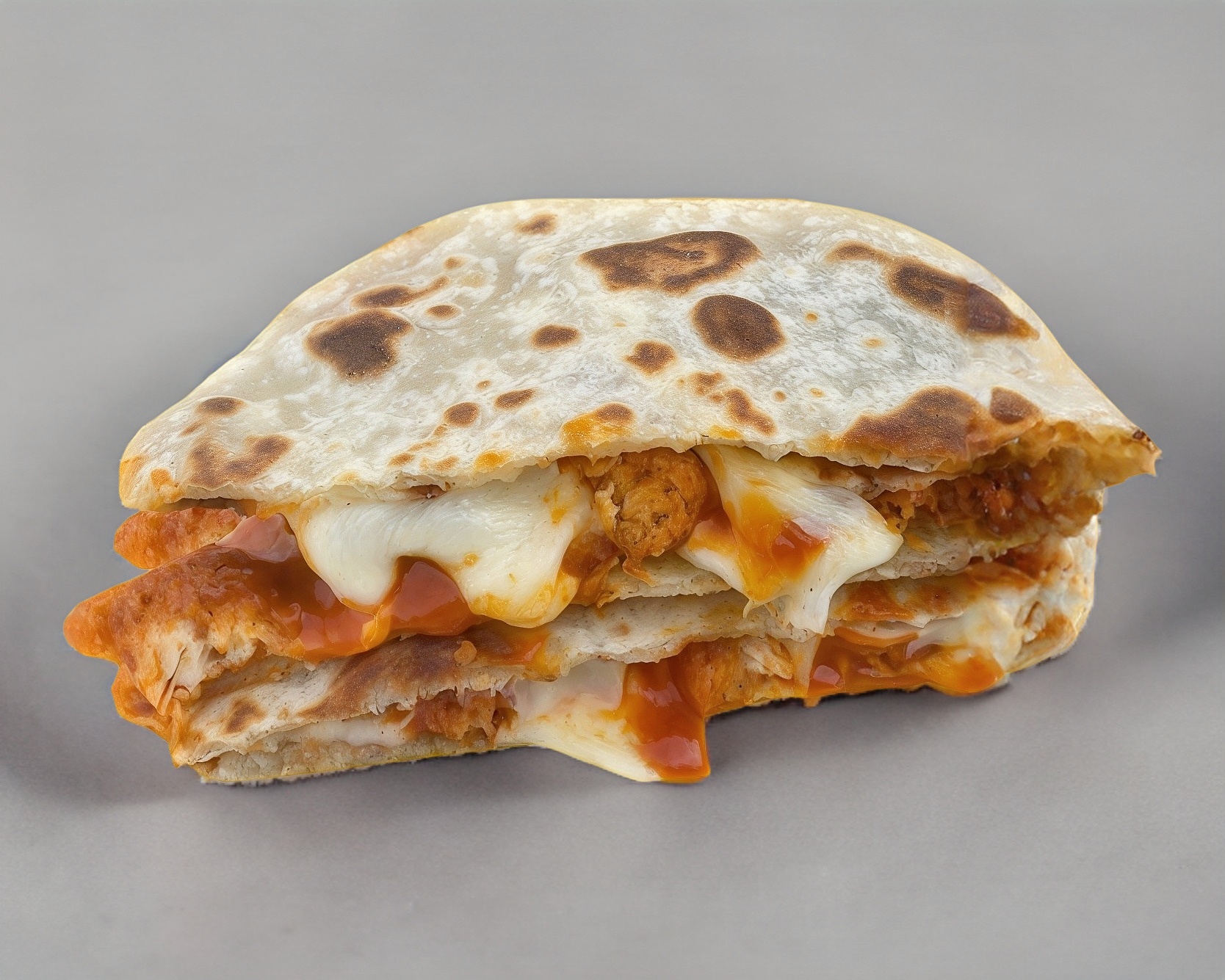 Quesadilla con 2 tortillas de harina gorditas, boneless con la salsa de tu elección y aderezo ranch.