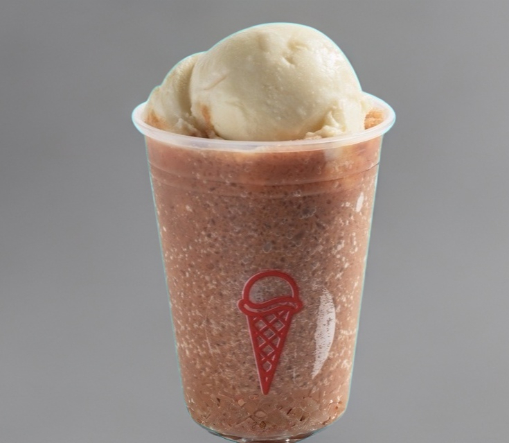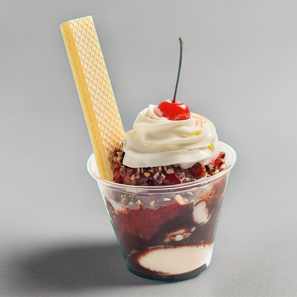 Sundae con una bola de nieve (sabor a elegir), acompañado de mermelada de fresa, chocolate liquido, trozo de nuez, cereza y una galleta.