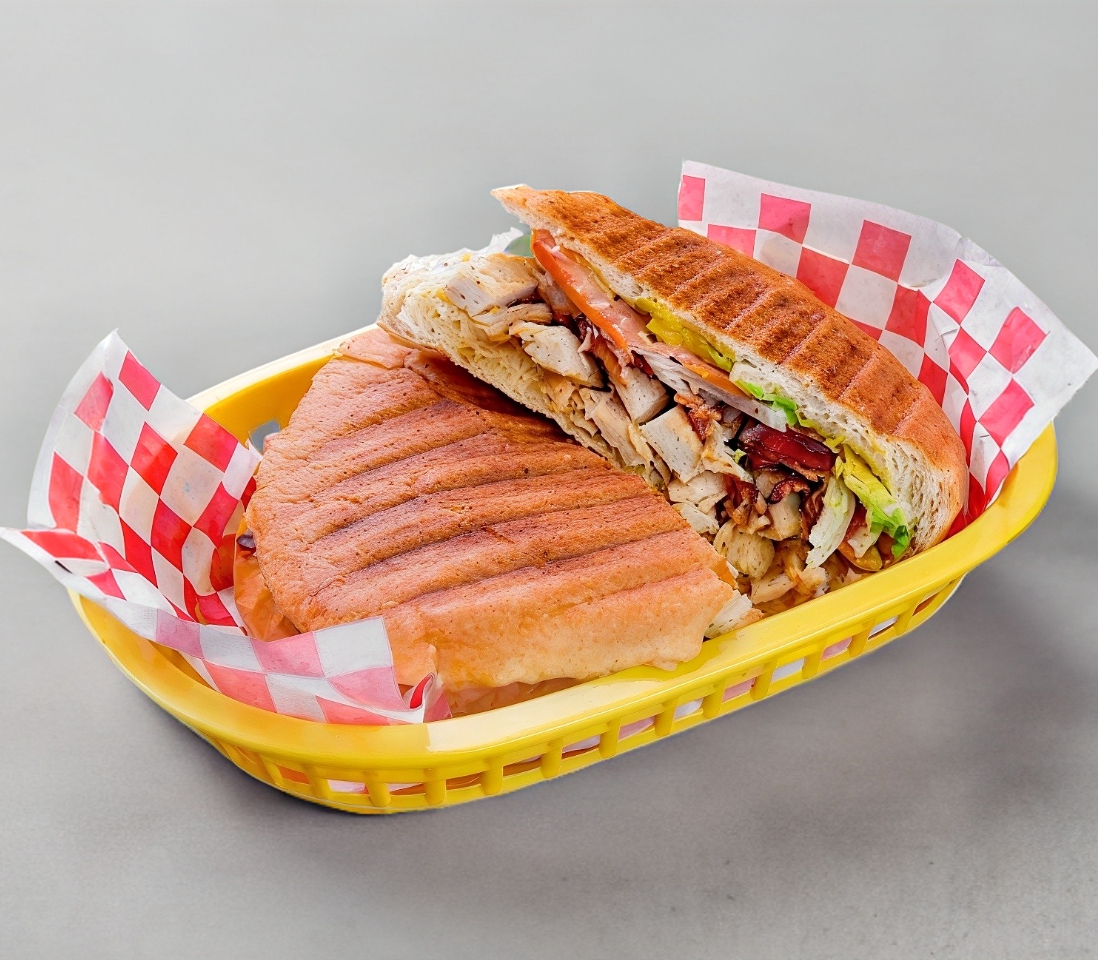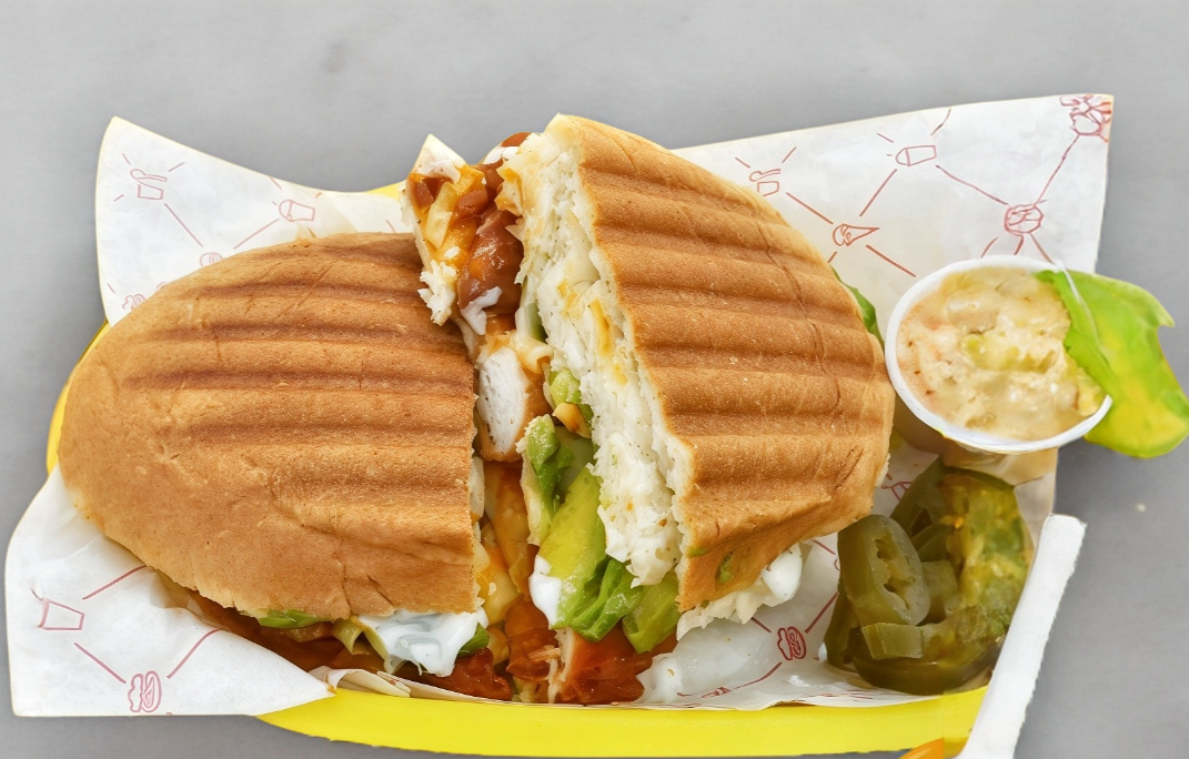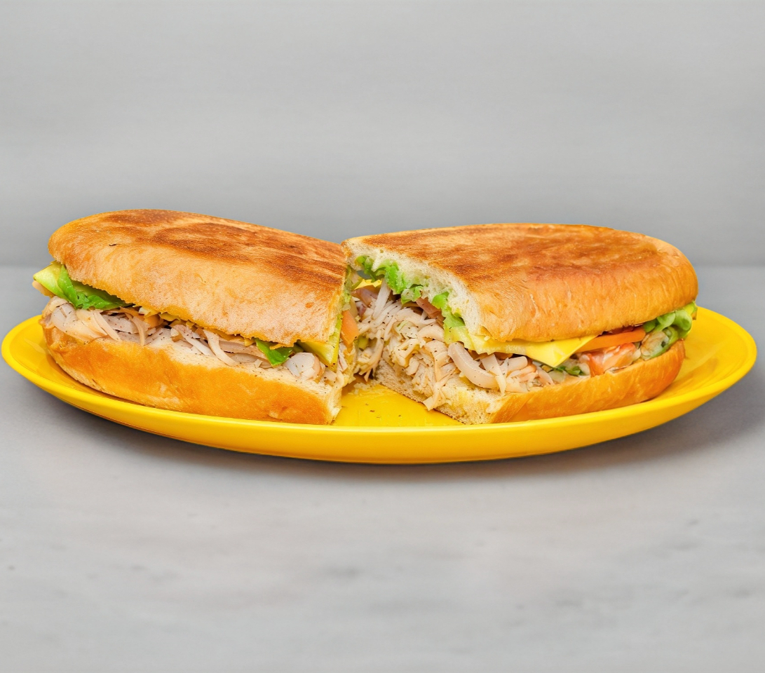 Torta con tiras de pechuga de pollo, tocino y aderezo ranch, todas nuestras tortas llevan pan telera, mayonesa, cebolla, tomate y aguacate.
