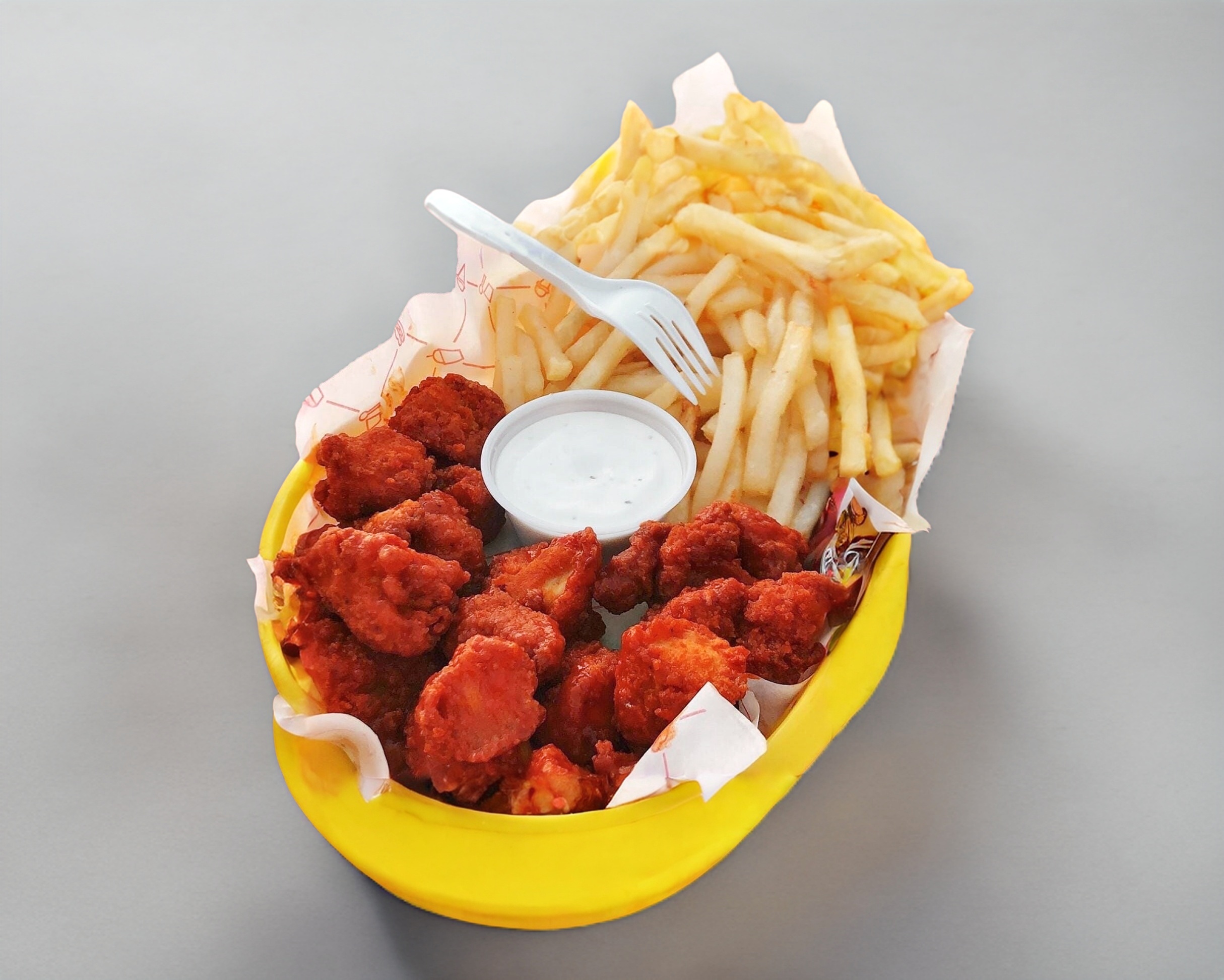 250gr de boneless con salsa de tu elección, acompañados de papas fritas y aderezo ranch .