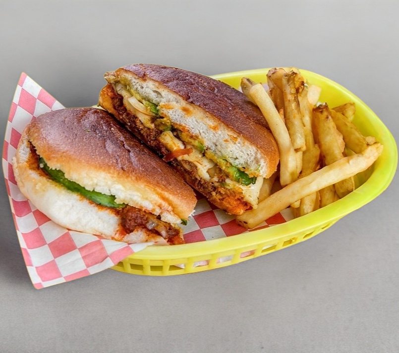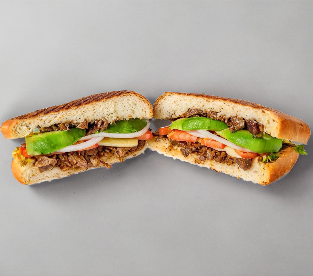 Torta con carne de res, queso chihuahua y chile verde tatemado. Todas nuestras tortas llevan pan telera, mayonesa, cebolla, tomate y aguacate.