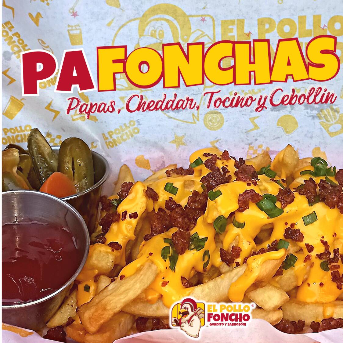 Papas fritas, queso cheddar, tocino y cebollin