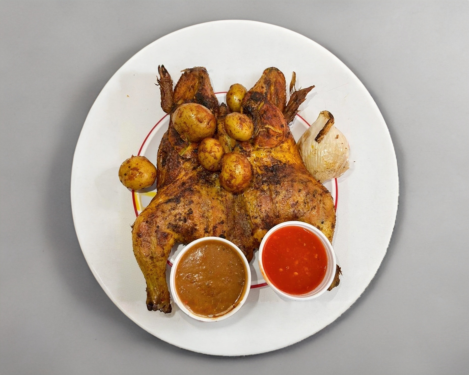 pollo entero, papas cambray, frijol, salsa, tortilla y cebolla