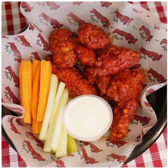 Incluye apio, zanahoria y aderezo ranch, BBQ, búfalo o mango habanero.