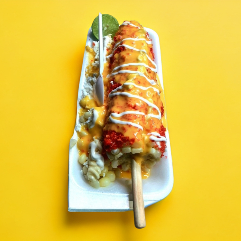 1 Elote entero, Sabritas a escoger, granos de elote, mantequilla, queso blanco, crema, limón, bañados con queso amarillo.