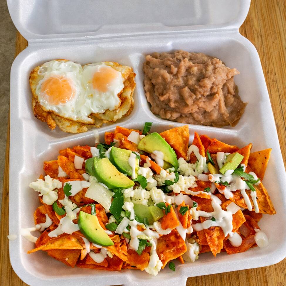 Porción grande bañada en salsa roja casera, , con queso, crema y aguacate. Recién hechos.”