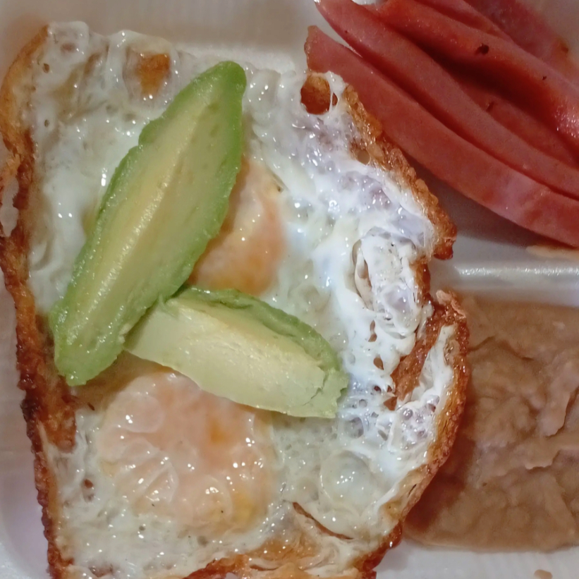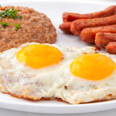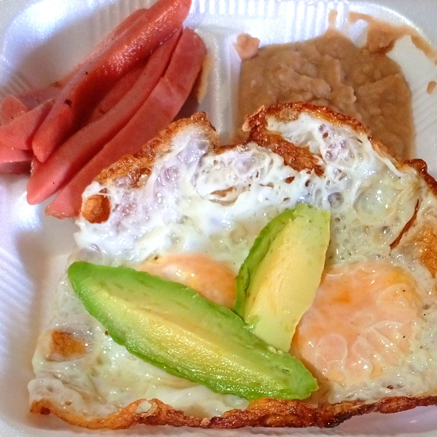 Dos huevos estrellados acompañado de frijoles salchicha guisada y tortillas