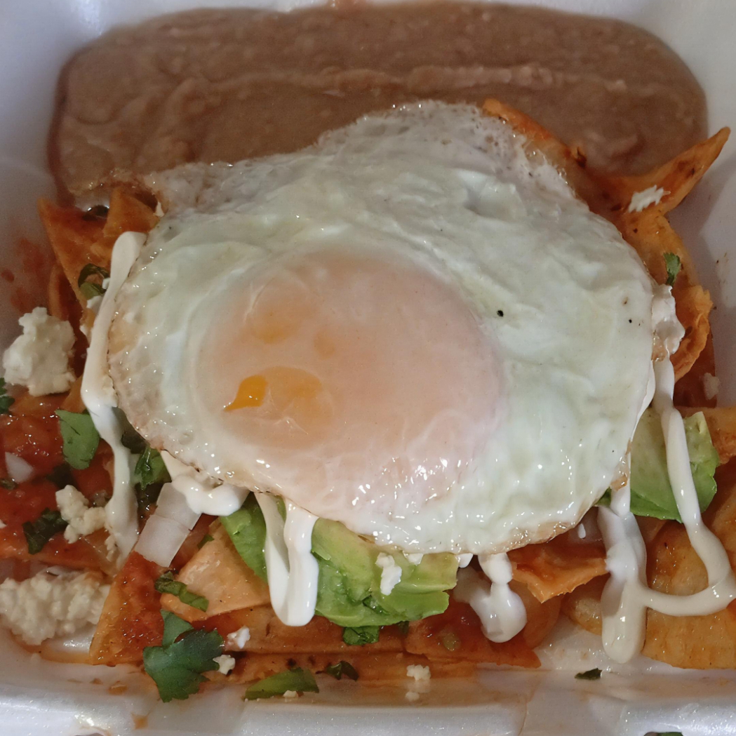 Porción grande bañada en salsa roja casera, un huevo ⭐ , con queso, crema y aguacate. Recién hechos.”